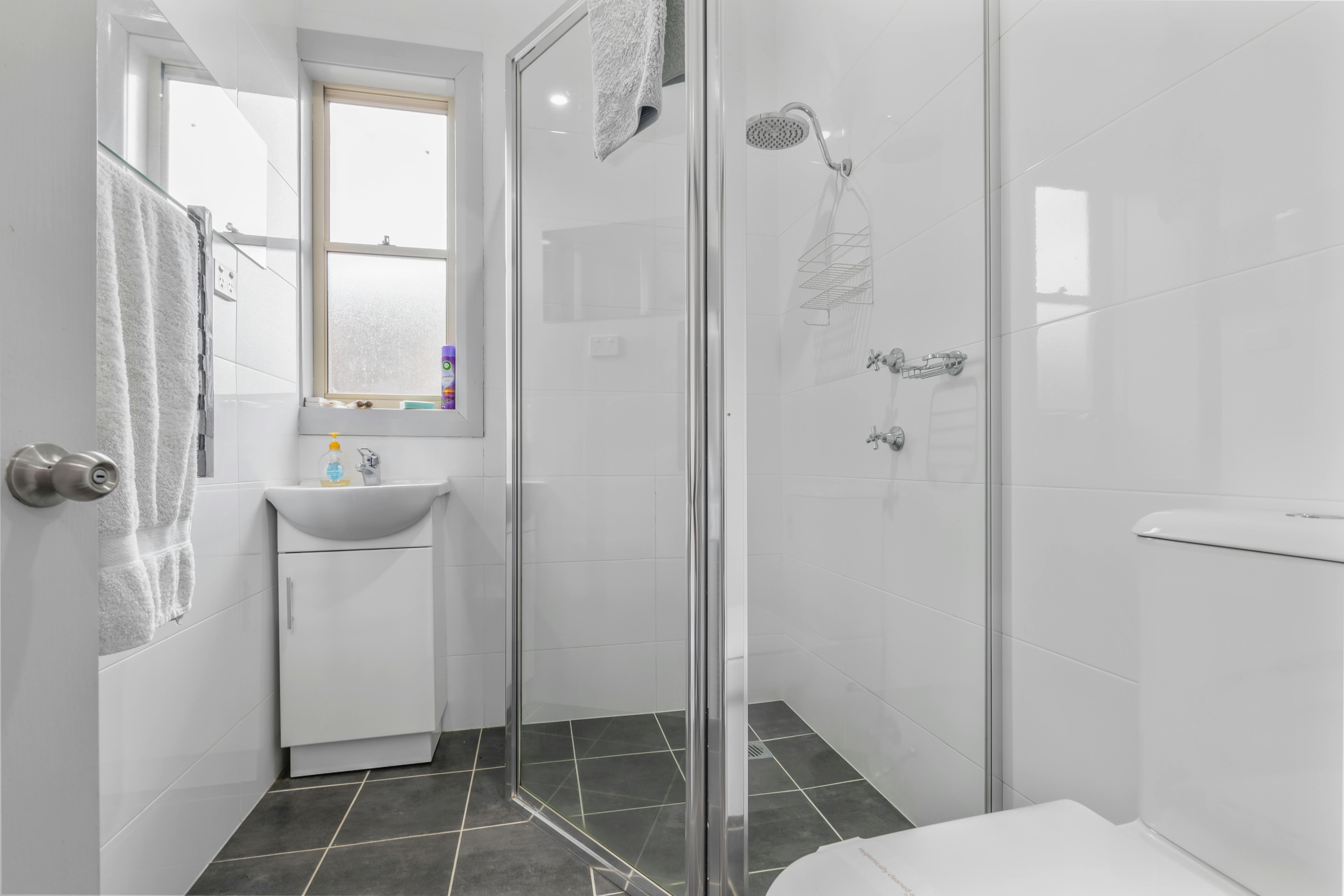 • Main bathroom at the rear also finished with stylish floor-to-ceiling tiles